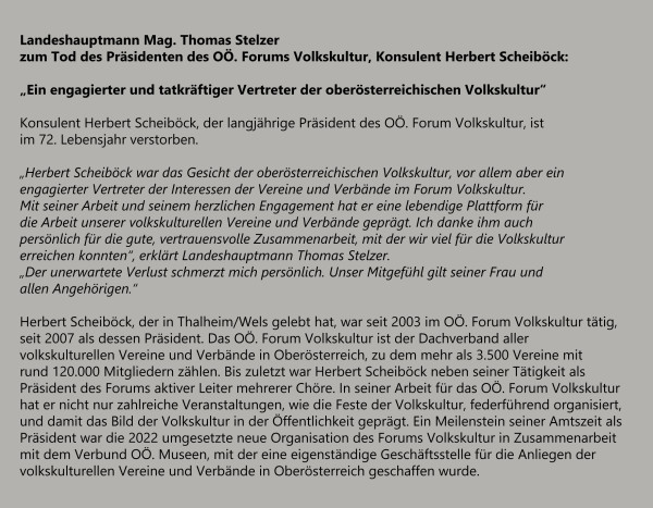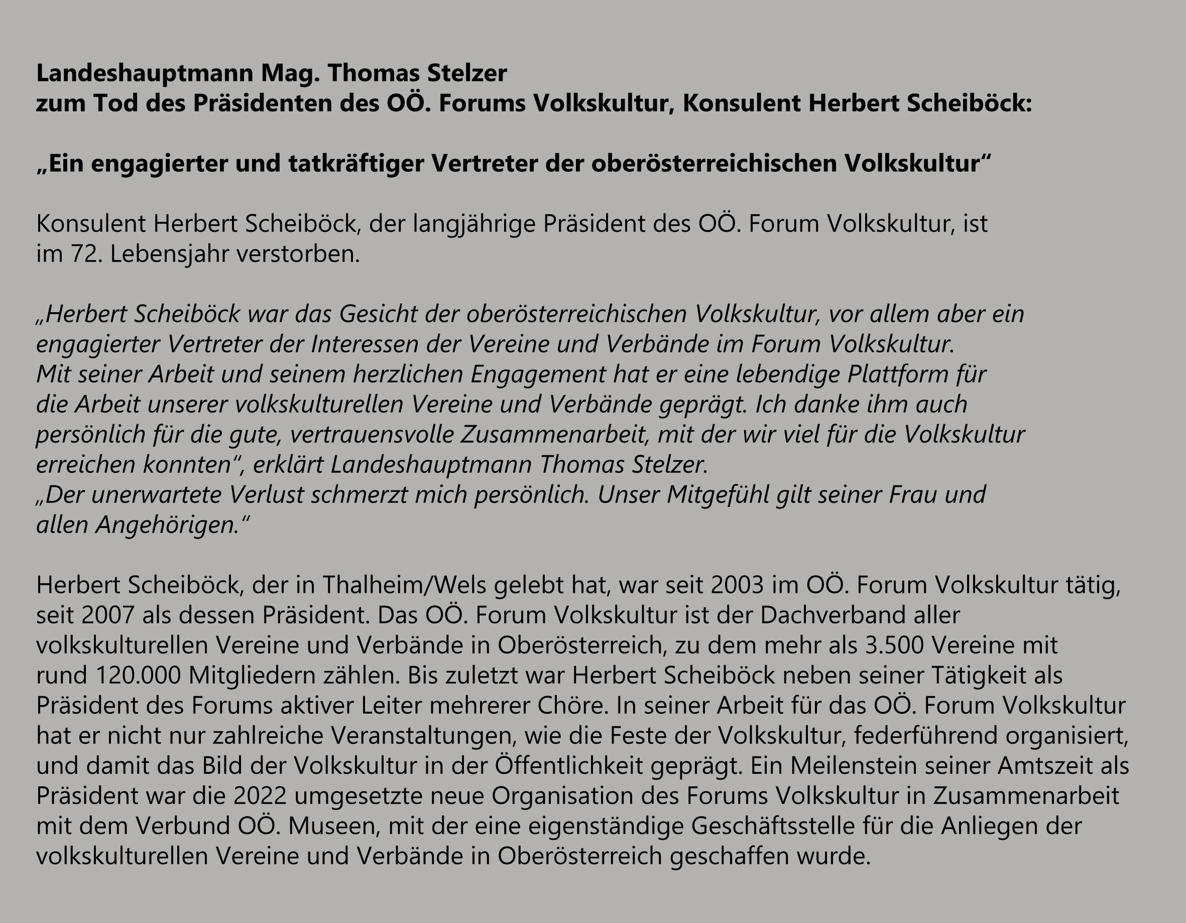 Wir verlieren mit Herbert Scheiböck eine liebenswerte, menschliche und weltoffene Persönlichkeit und blicken mit großer Dankbarkeit auf die gemeinsame Arbeit und Zeit zurück. Sein umfangreiches freiwilliges Engagement im Kulturbereich, seine freundliche und geduldige Art sowie seine Bescheidenheit werden uns auch weiterhin Vorbild sein. Die dankbare Erinnerung an Herbert Scheiböck bleibt in uns.
