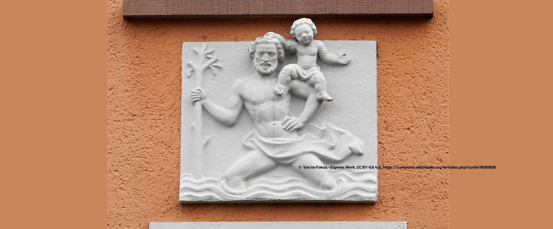 Der Heilige Christophorus ist einer der vierzehn Nothelfer. Viele Hauswände und Kirchenfassaden zeigen sein Abbild, wie er das Jesuskind auf seinen Schultern über einen Fluss trägt. An jedem Tag, wo man den überdimensionalen Christophorus auf der Kirchenwand schaut, ist man vom jähen Tod verschont, so heißt es.