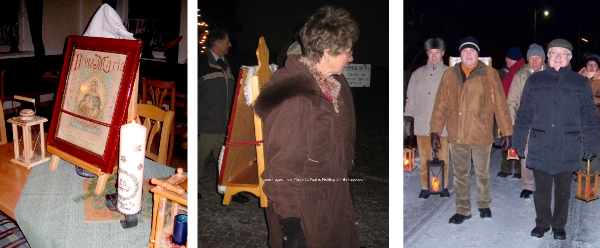 In früheren Jahren waren in der Pfarre St. Paul zu Pichling drei bis vier Bilder unterwegs, dann jedoch wurde es ruhig um diesen Adventbrauch. Seit dem Jahr 1989 wird dieser Brauch nur mehr von der Tanzgruppe „Fröhlicher Kreis“ gepflegt. Ein Marienbild wird ab 15. Dezember bis zum Heiligen Abend von Familie zu Familie gebracht, dabei wird um Herberge für eine Nacht gebeten. Das derzeit verwendete Bild stammt aus meinem Elternhaus und wurde im Gedenken an meine verstorbene Mutter von uns der Pfarre zur Verfügung gestellt. Die für den Transport dieses Marienbildes in Verwendung stehende „Kraxe“ wurde freundlicherweise von Josef Anzinger angefertigt.