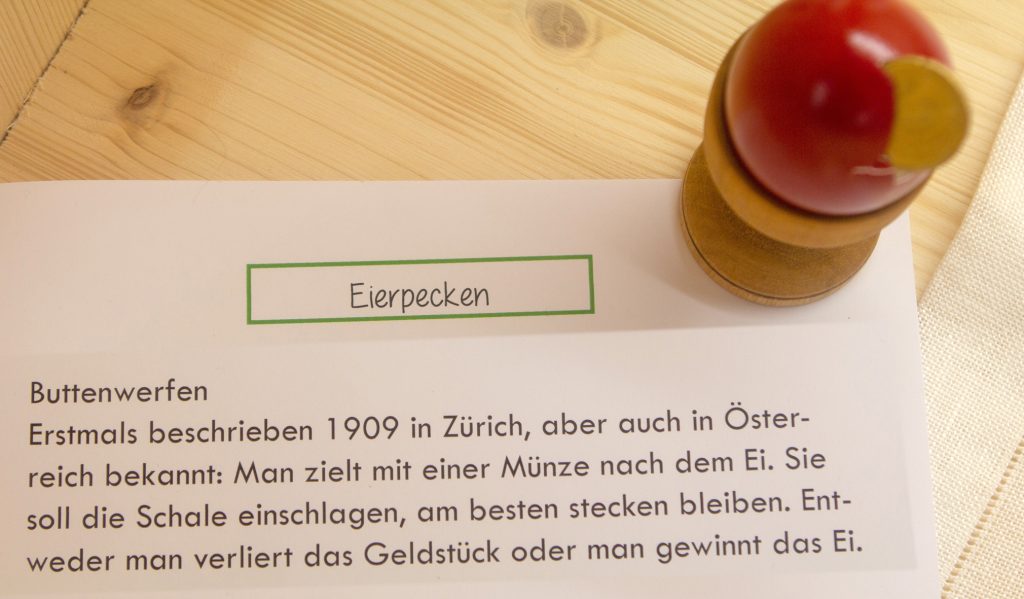 Eierpecken: Zwei „Eierpecker“ schlagen ihre hartgekochten Eier mit der Spitze aneinander, es gewinnt derjenige, dessen Ei dabei ganz bleibt.